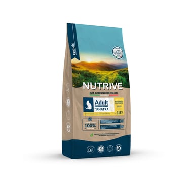 Carne disidratata 35% (Anatra min. 10%), granturco, farina di semola di grano duro, grasso animale, riso, glutine di mais, proteine animali idrolizzate, farina di carruba, estratto naturale di castagno, sali minerali.